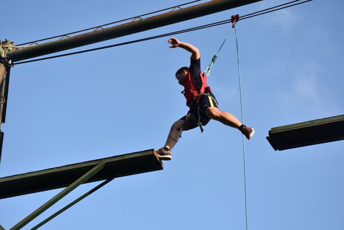 这是一项个人自我挑战的项目。每位队员都要在穿戴好安全装备的情况下,爬上断桥,从断桥的一侧跨跳到另一侧,然后在跳回来,最后安全下来。